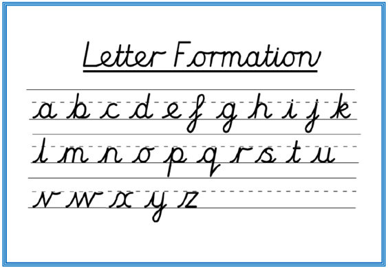 After many 'free flow' exploratory experiences, where children can rehearse writing in their own way, they are introduced to cursive letter formation whereby the letters are written the sa