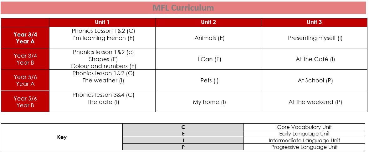 Our MFL curriculum has been designed to progressively develop skills in French. Lesson themes ensure that children acquire a bank of vocabulary organized around topics. Development is progressive as children build on previous knowledge from units already studied. All our children are taught French in a weekly discreet lesson, in half-termly blocks, delivered by experienced, qualified specialists.