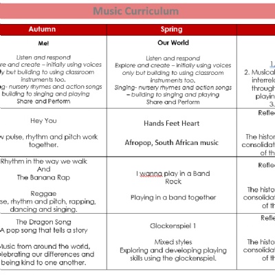 Our long term plan ensures a broad exposure to different genres of music, and practical opportunities to develop as musicians and singers. Opportunities are taken to perform in class, in whole assemblies and also to parents and the wider community. For example the lower key stage 2 children take part in the Vale Choir event where schools from the local area are taught by music specialists and then perform together.
