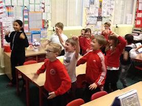 Oak Class using their bodies to find the pitch and rhythm of a piece of music.