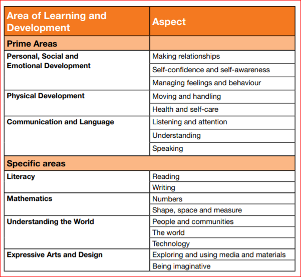 - the areas of learning and development which must shape activities and experiences (educational programmes) for children in all early years settings.